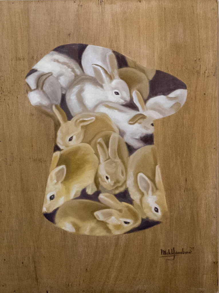 Artworks, May I Have Your Attention Please Bunnies in Hat Mek 030824 “Bunnies in Hat”60 x 45 cmoil on wood2017 Part of of solo exhibition, “May I Have Your Attention Please”23 September – 7 October 2017GF / The Metro Gallery, San Juan City